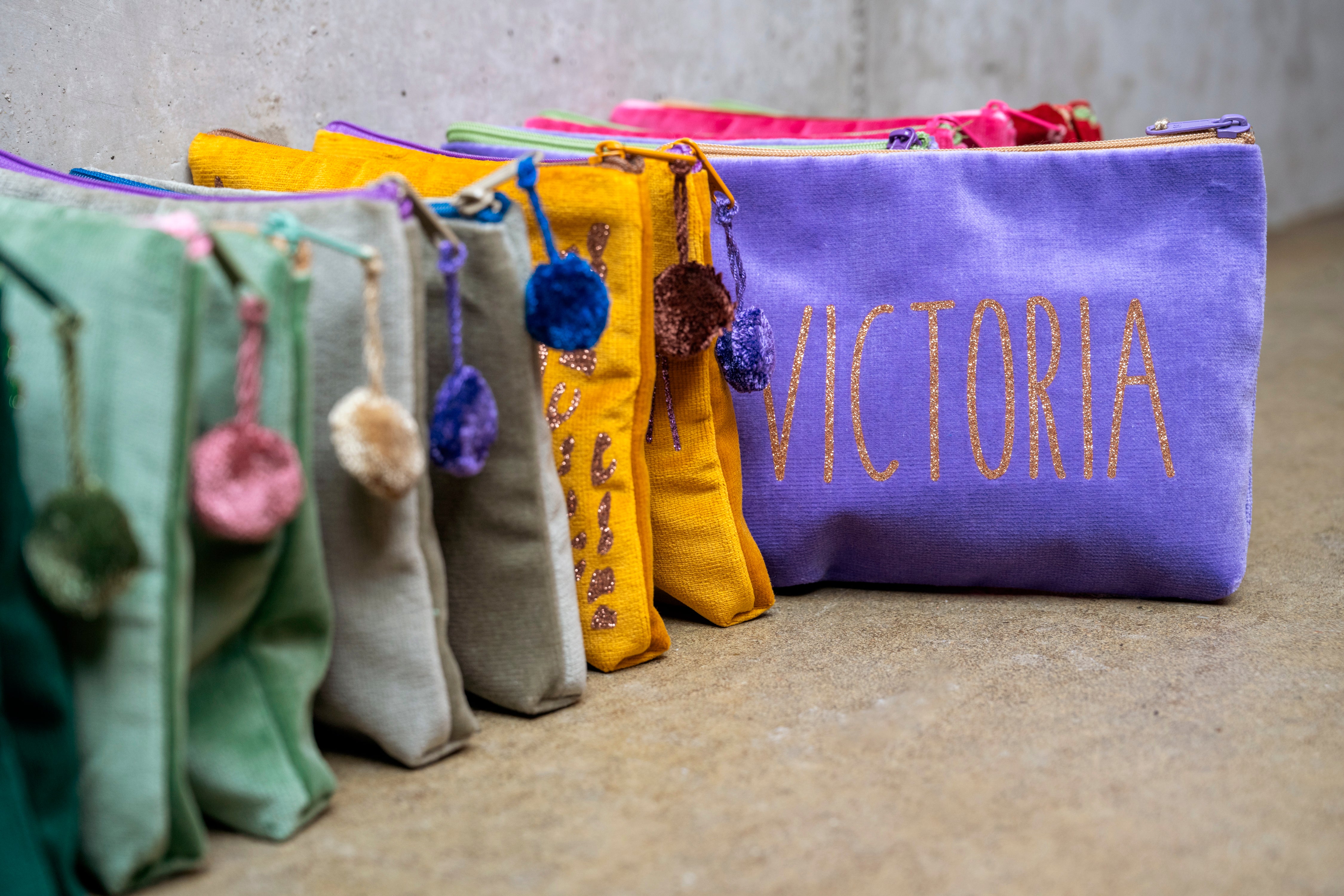 Die individuellen Samttaschen können mit deinem Namen versehen werden.
